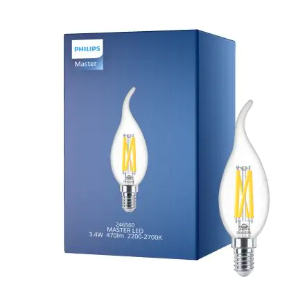 Philips MASTER LED E14 Bent-tip Candle Filament Clear 3.4W 470lm - 922-927 Dim To Warm | Best Colour Rendering - Dimmable - Replaces 40W