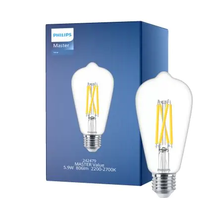 Philips MASTER Value LED Bulb E27 Edison Filament Clear 5.9W 806lm - 922-927 Dim to Warm | Best Colour Rendering - Replaces 60W